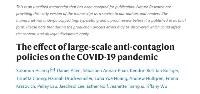 原文出处:Hsiang, S., Allen, D., Annan-Phan, S. et al. The effect of large-scale anti-contagion policies on the COVID-19 pandemic[J]. Nature (2020). https://doi.org/10.1038/s41586-020-2404-8.